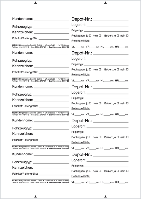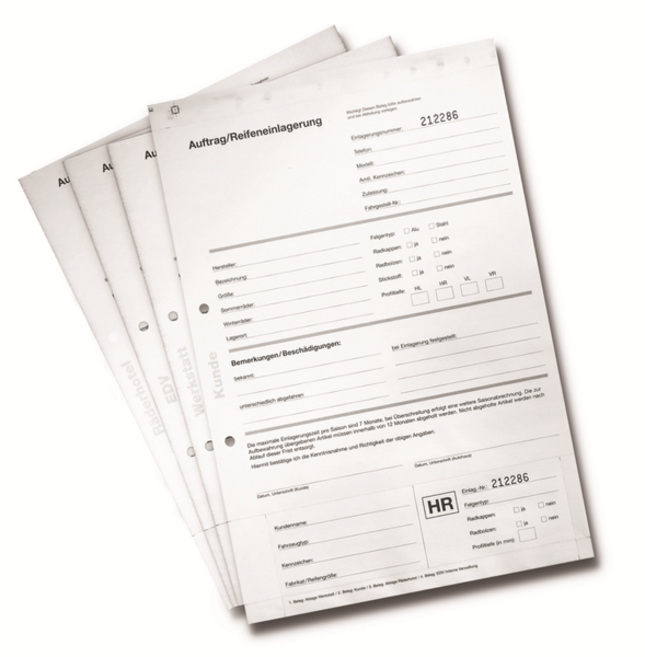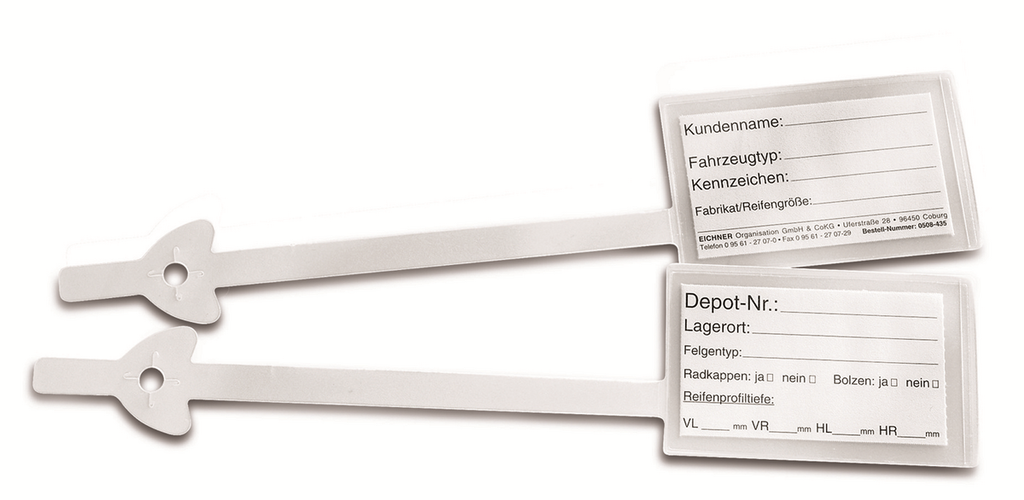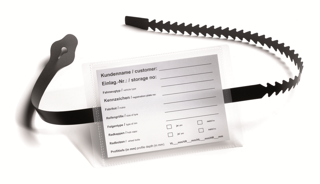 Rad-/Reifenanhänger-Set für eine exakte Identifizierung aller Kundenräder. Das Grundelement dieser Kennzeichnungshilfe ist eine besonders widerstandsfähige Ventiltasche aus umweltschonendem PP-Material. Zum Lieferumfang gehören je nach Ausführung Beschriftungsetiketten oder ein komplettes Auftragsformular. Dieser Schnelltrennsatz vereinfacht die interne Organisation. Durch die fortlaufende Nummerierung im oberen Bereich und der Wiederholung dieser Zahlenfolge auf den herauslösbaren Etiketten im unteren Formularabschnitt ist der eindeutige Bezug zwischen Radsatz und Kunde gewährleistet. Ganz gleich, welche Ausführung Sie wählen, der Anhänger nimmt das jeweilige Etikett auf und schützt es zuverlässig vor Schmutz und Feuchtigkeit.