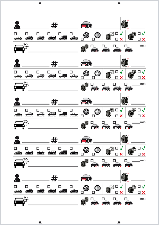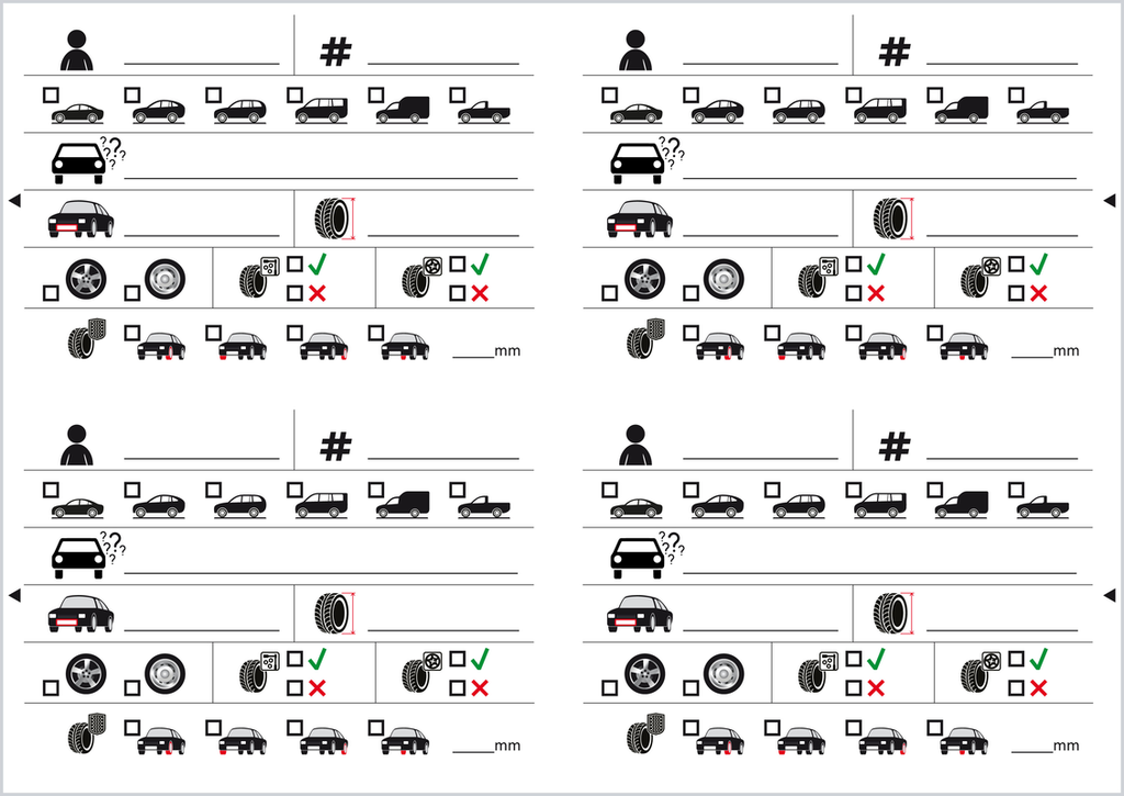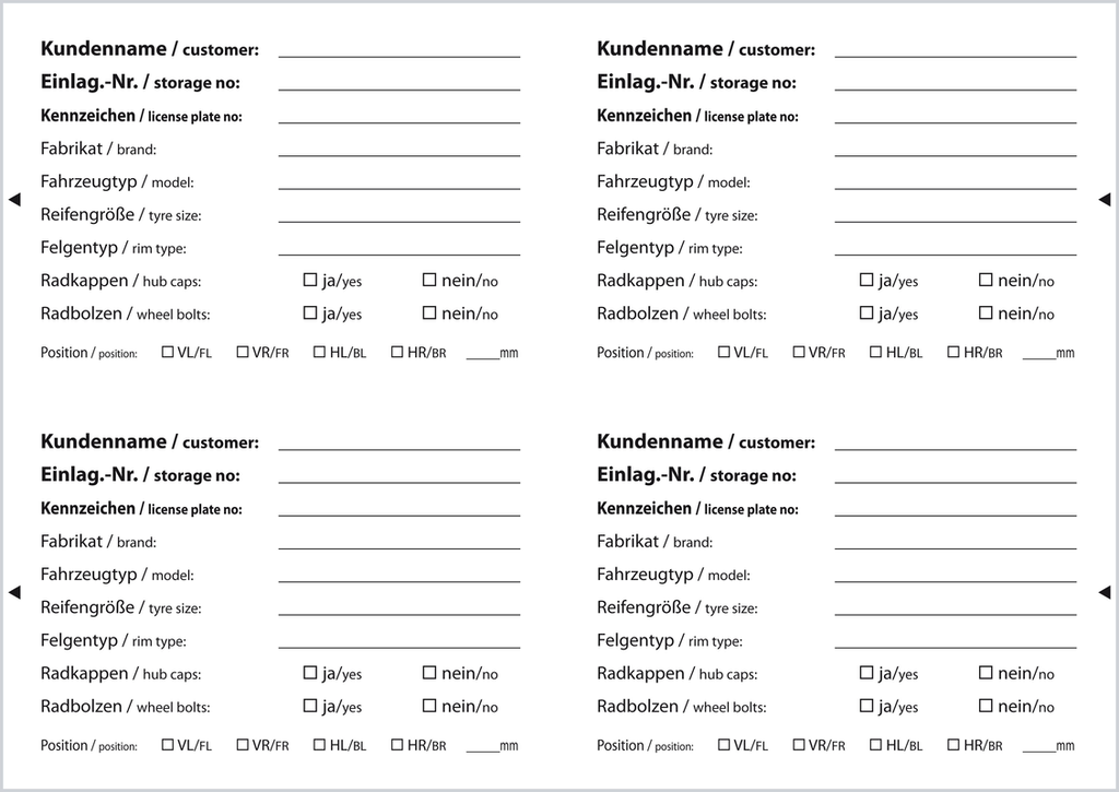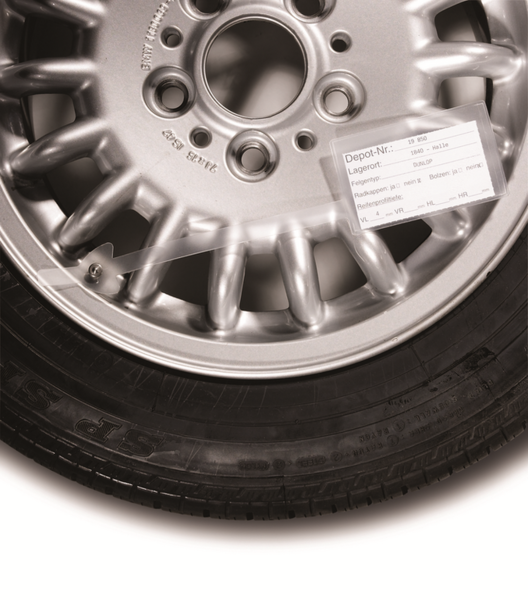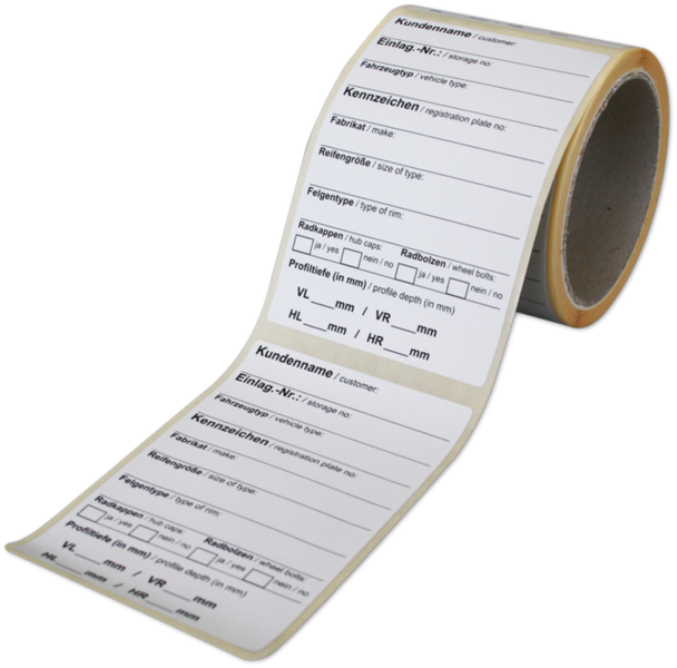 Einfach lagern und wiederfinden - mit den Spezialaufklebern kein Problem mehr. Die hochwertigen Sticker mit metallisierter Rückseite haften optimal auf den Rädern, ganz gleich ob trocken, naß oder verschmutzt. Der Vordruck enthält alle wichtigen Informationen zur Einlagerung, wie z.B. Kundenname, Einlagerungsnummer und Kennzeichen, aber auch Fahrzeugmarke und -typ, Reifengröße und Felgentyp sowie Felder für Profiltiefe, Radkappen und -bolzen.